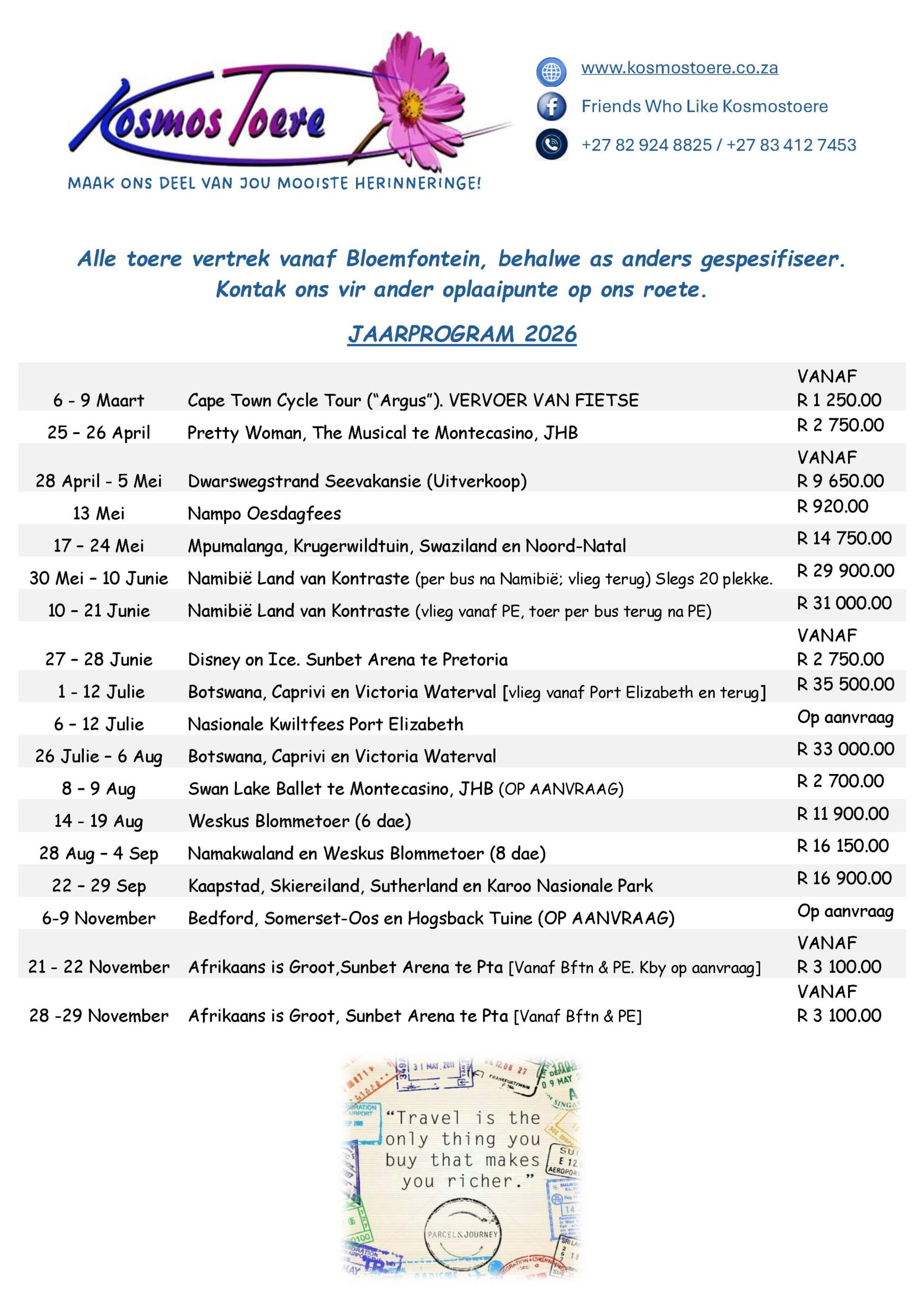 U sal opmerk dat daar aansienlik minder toere op ons 2026 program is. Ons wil die aftydjies tussenin net gebruik om rustig te raak, asem te skep, tyd te maak vir ander dinge in die lewe wat ook belangrik is en om 2027 aan te pak met nuwe energie, ‘n vars gemoed, nuwe idees en, heelwaarskynlik, ‘n paar nuwe items op ons jaarprogram.